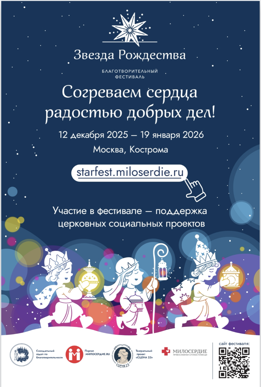 По благословению Святейшего Патриарха Московского и Всея Руси КИРИЛЛА с 12 декабря 2025 года по 19 января 2026 года пройдет благотворительный фестиваль «Звезда Рождества», организованный православным порталом «Милосердие.ru» при поддержке Синодального отдела по церковной благотворительности и социальному служению.